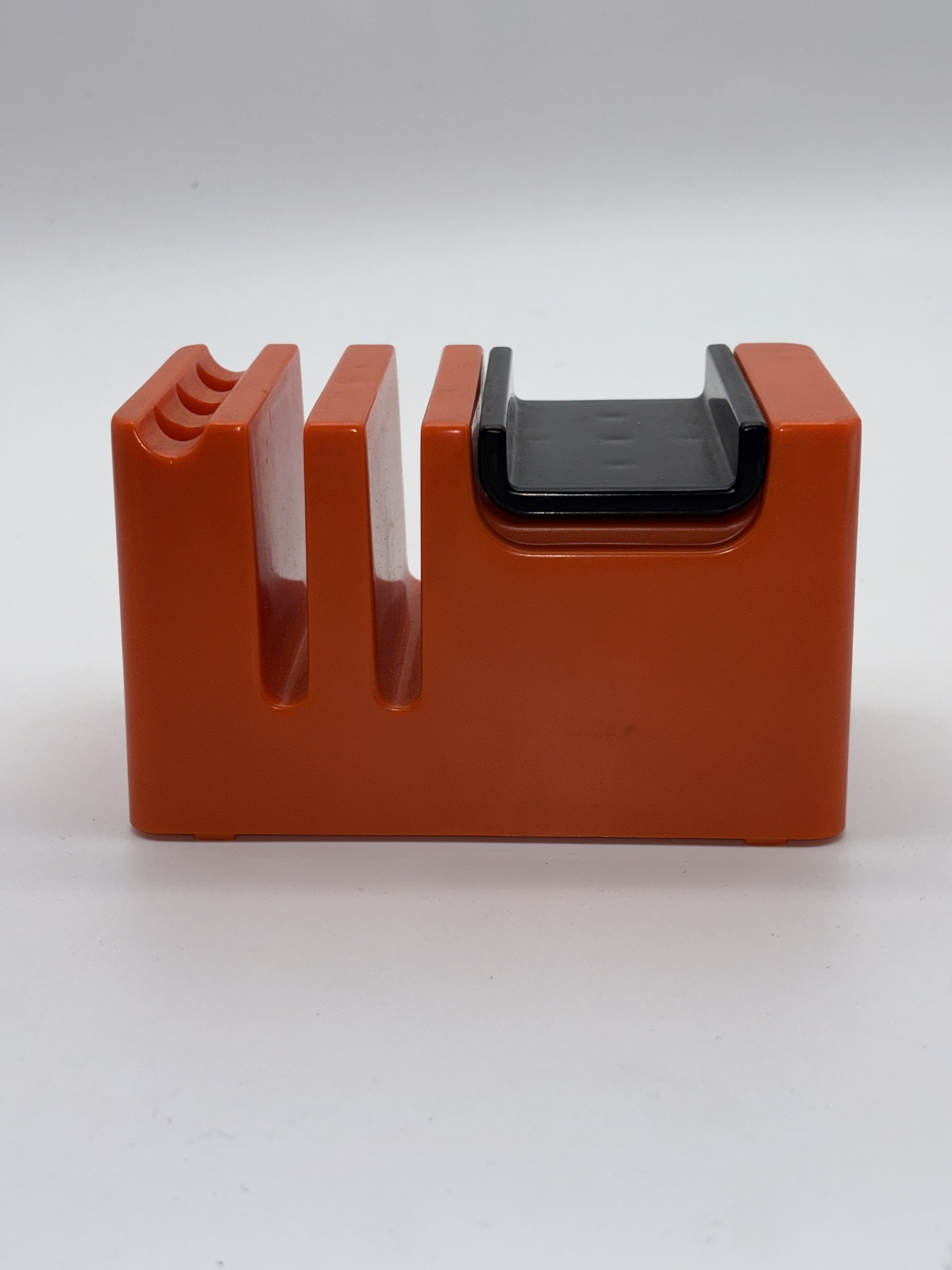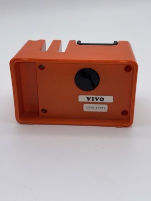 Bureau organizer met wachtmuziek voor telefoon, vintage ' 70s. Deze muziekdoos van oranje en zwart kunststof, speelt Love Story.